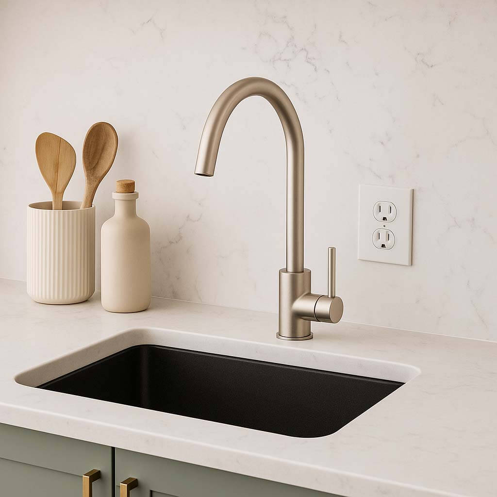 Μπαταρία κουζίνας Single Lever Round. Η αναμεικτική μπαταρία κουζίνας “Round” συνδυάζει μίνιμαλ σχεδιασμό με λειτουργικότητα. Διαθέτει μοχλό ενός χειρισμού για εύκολη ρύθμιση της θερμοκρασίας και της ροής του νερού, καθώς και κεραμικό δίσκο Ø35mm που εξασφαλίζει αντοχή και μακροχρόνια χρήση. Μπορεί να τοποθετηθεί επάνω στον πάγκο ή τον νεροχύτη.