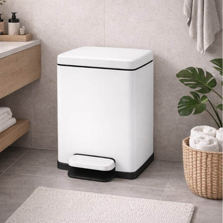 Κάδος απορριμμάτων μπάνιου λευκός 7 LT με ματ υφή.  Διαθέτει πεντάλ και μηχανισμό soft close για αργό και αθόρυβο κλείσιμο. Είναι μεταλλικός με πλαστικές λεπτομέρειες. Στο εσωτερικό έχει πλαστικό αποσπώμενο κάδο για ευκολία στο καθάρισμα αλλά και για μεγάλη αντοχή. Μοντέρνα αξεσουάρ μπάνιου για να διαμορφώσετε κατάλληλα τον χώρο σας.