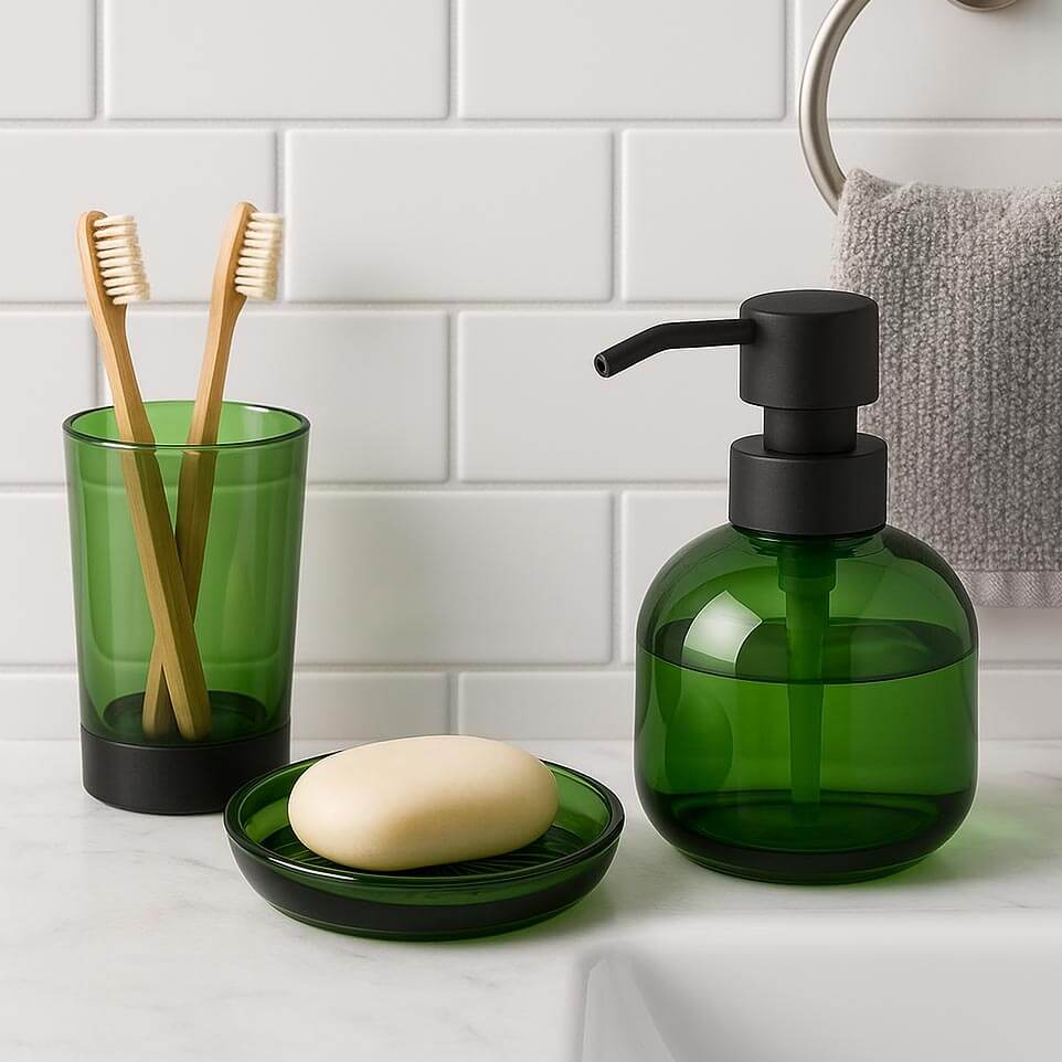 Αξεσουάρ μπάνιου 3 τεμάχια σετ dispencer / ποτηροθήκη / σαπουνοθήκη σε πράσινο χρώμα από γυαλί. Μοντέρνα και λειτουργικά αξεσουάρ για το μπάνιο.