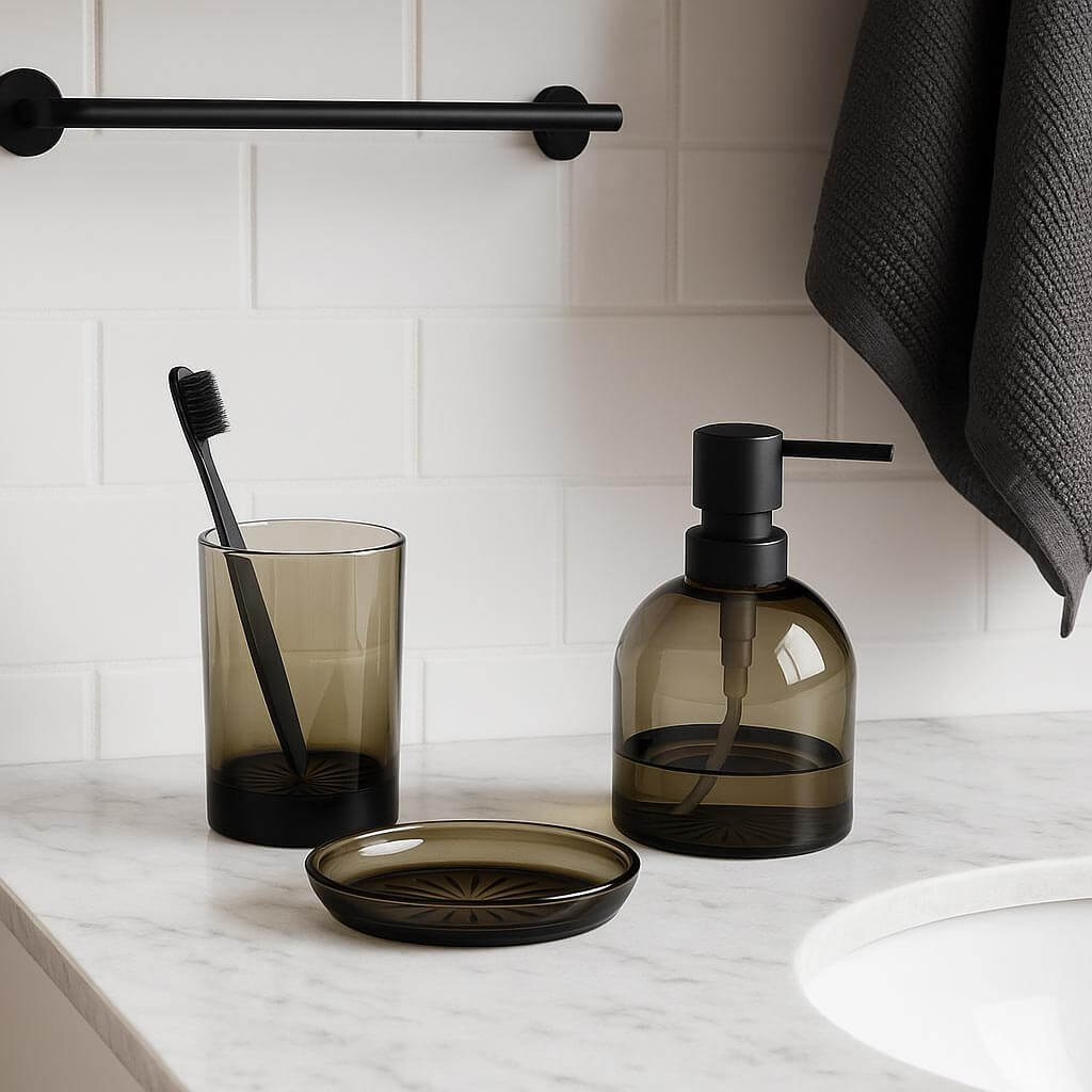 Αξεσουάρ μπάνιου 3 τεμαχίων σετ dispencer / σαπουνοθήκη / ποτηροθήκη από γυαλί σε μαύρο χρώμα. Μοντέρνα και λειτουργικά για να διαμορφώσετε τον χώρο σας.