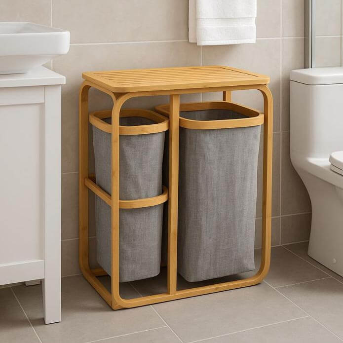 Πολυχρηστικό καλάθι απλύτων με 3 διαφορετικές θήκες υφασμάτινες. Μια μεγάλη και 2 σε μικρότερο μέγεθος. Μπορεί να χρησιμοποιήθει και σαν καλάθι αποθήκευσης. Στο πάνω μέρος μπορείτε να στηρίξετε ελαφριά αντικείμενα. Μοντέρνα και καλής κατασκευής αξεσουάρ μπάνιου για να διαμορφώσετε τον χώρο σας.