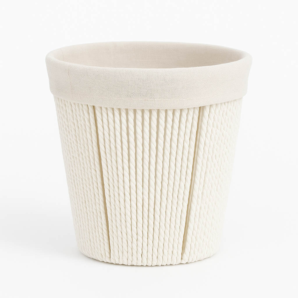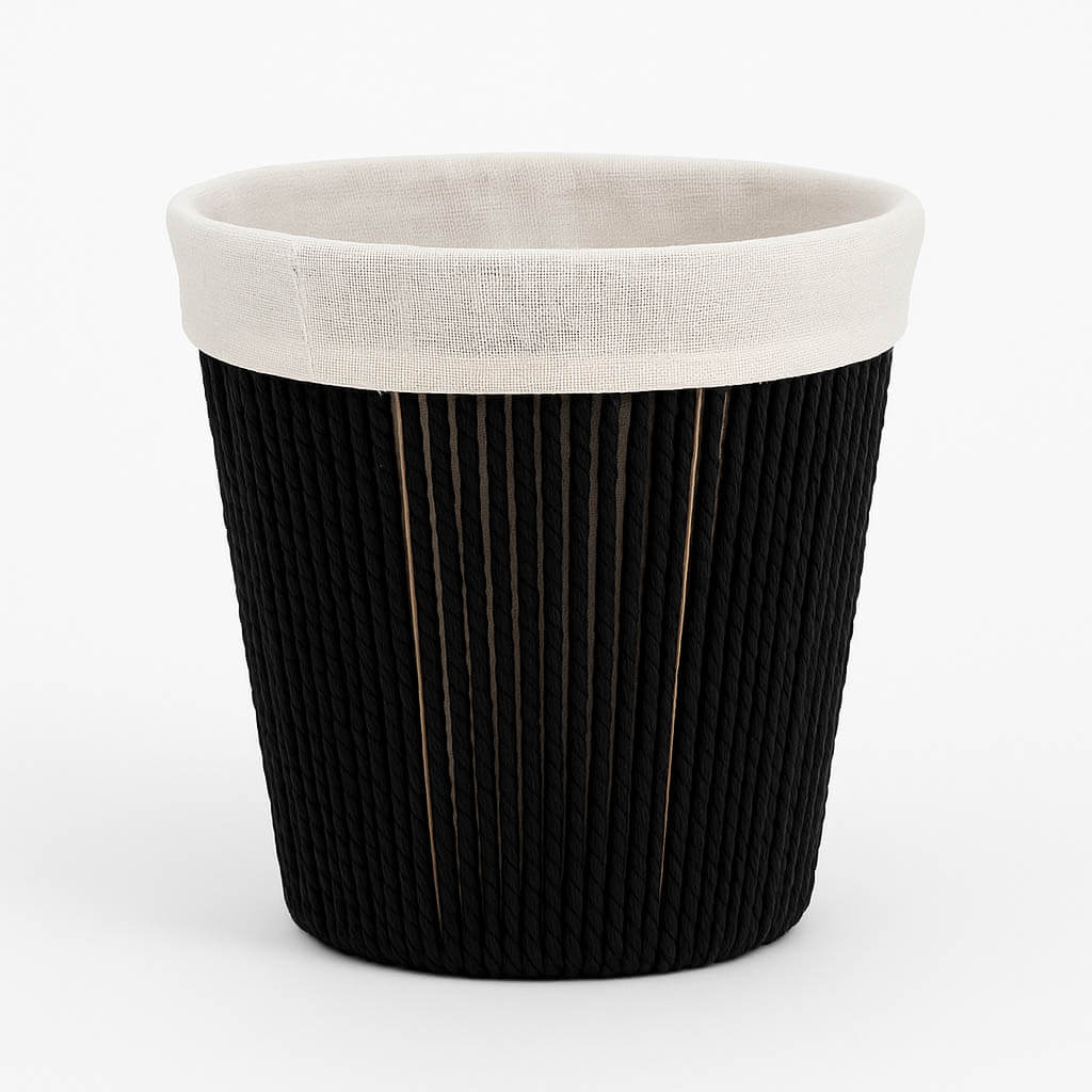 Πλεκτό διακοσμητικό καλάθι από λεπτό σχοινί με εσωτερική μπεζ υφασμάτινη θήκη. Σε δύο αποχρώσεις μαύρο και λευκόΔιάσταση καλαθιού 25 cm ύψος επί 23 Φ. Αυτό το καλάθι δεν είναι απλώς ένας χώρος αποθήκευσης, αλλά ένα κομψό διακοσμητικό στοιχείο που θα αναβαθμίσει κάθε γωνιά του σπιτιού σας. Κατασκευασμένο από χειροποίητες φυτικές ίνες, το εξωτερικό του προσφέρει μια πλούσια υφή και μια ρουστίκ-μοντέρνα αίσθηση. Το ιδιαίτερο πλέξιμο δημιουργεί μια οπτικά ελκυστική διάφανη δομή, ενώ στο εσωτερικό του υπάρχει μια αποσπώμενη υφασμάτινη επένδυση σε φυσική, ανοιχτόχρωμη απόχρωση, η οποία όχι μόνο προστατεύει το περιεχόμενο αλλά και προσθέτει μια αίσθηση απαλότητας και φινέτσας. Ιδανικό για το μπάνιο, το υπνοδωμάτιο, το σαλόνι ή ακόμα και το γραφείο.