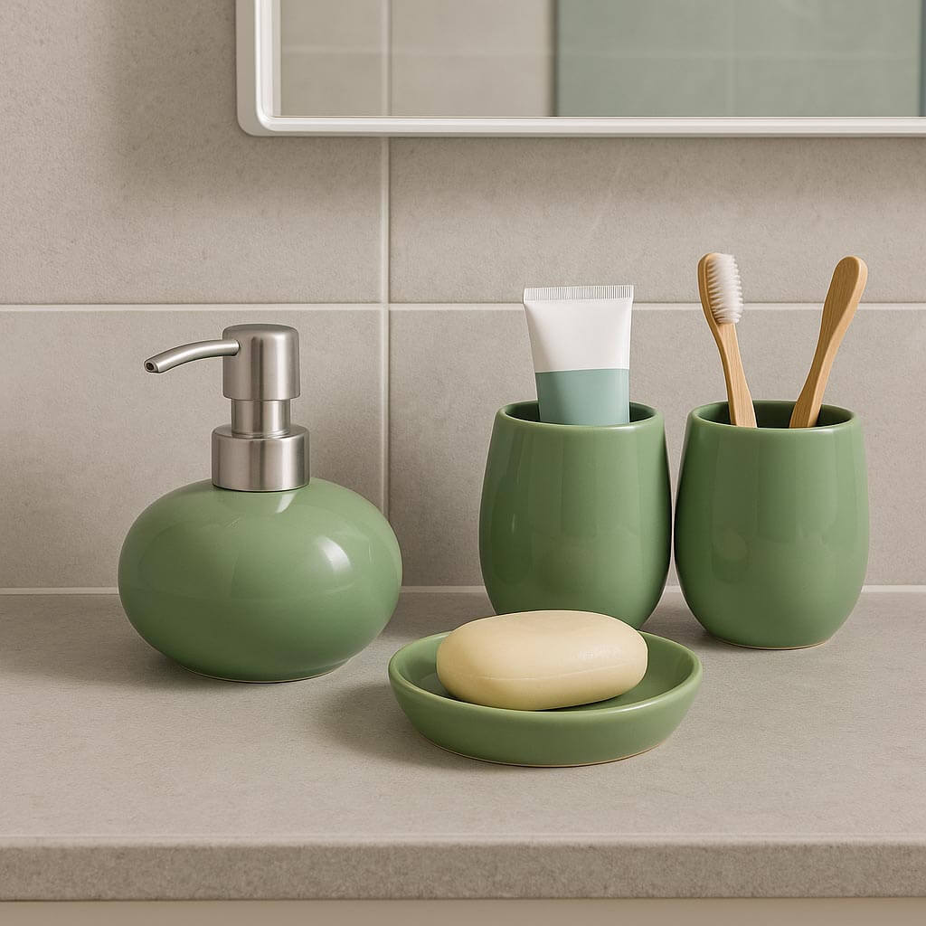 Σετ αξεσουάρ μπάνιου 4 τεμαχίων με dispencer 2 ποτηροθήκες και σαπουνοθήκη διαθέσιμα σε 2 αποχρώσεις. Ανθεκτικά κεραμικά υλικά για να διαμορφώσετε κατάλληλα των χώρο σας.