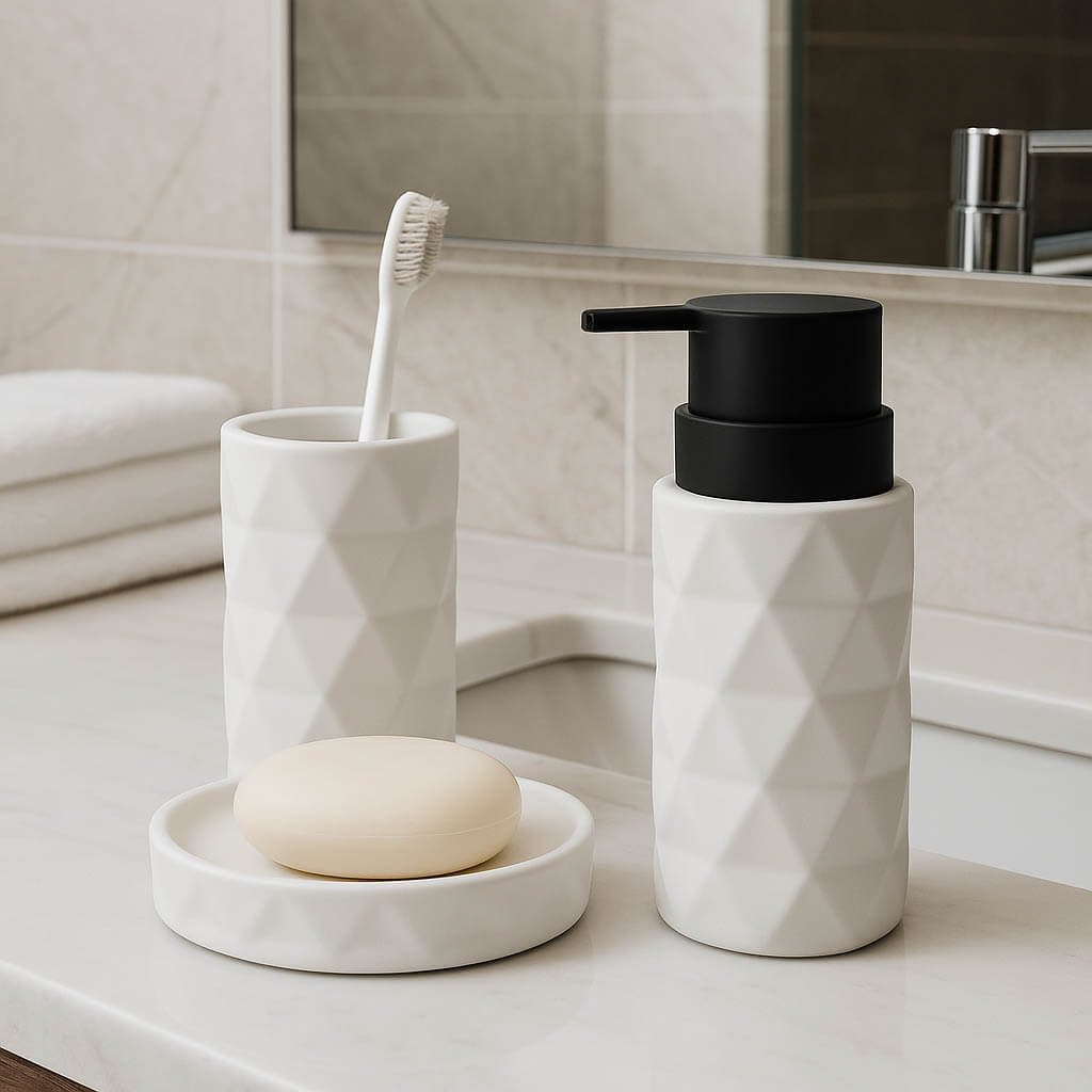 Αναβαθμίστε το μπάνιο σας με αυτό το κομψό σετ μπάνιου 3 τεμαχίων σε μοντέρνο λευκό ματ χρώμα. Ο γεωμετρικός σχεδιασμός με διαμάντι-υφή προσφέρει μια διακριτική πολυτέλεια, ενώ η στιβαρή κατασκευή από κεραμικό εξασφαλίζει ανθεκτικότητα και καθημερινή λειτουργικότητα.