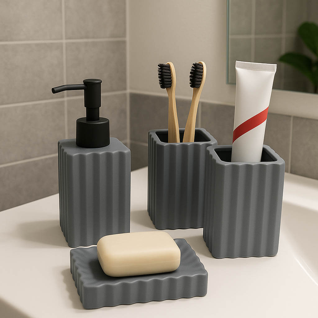 Σετ μπάνιου 4 τεμαχίων σε ανθρακί χρώμα , ματ υφή και με γραμμικό σχέδιο. Κατασκευασμένο από κεραμικό υλικό για αντοχή και λειτουργικότητα στη χρήση. Αναβαθμίστε το μπάνιο σας με κομψά και ανθεκτικά αξεσουάρ μπάνιου.