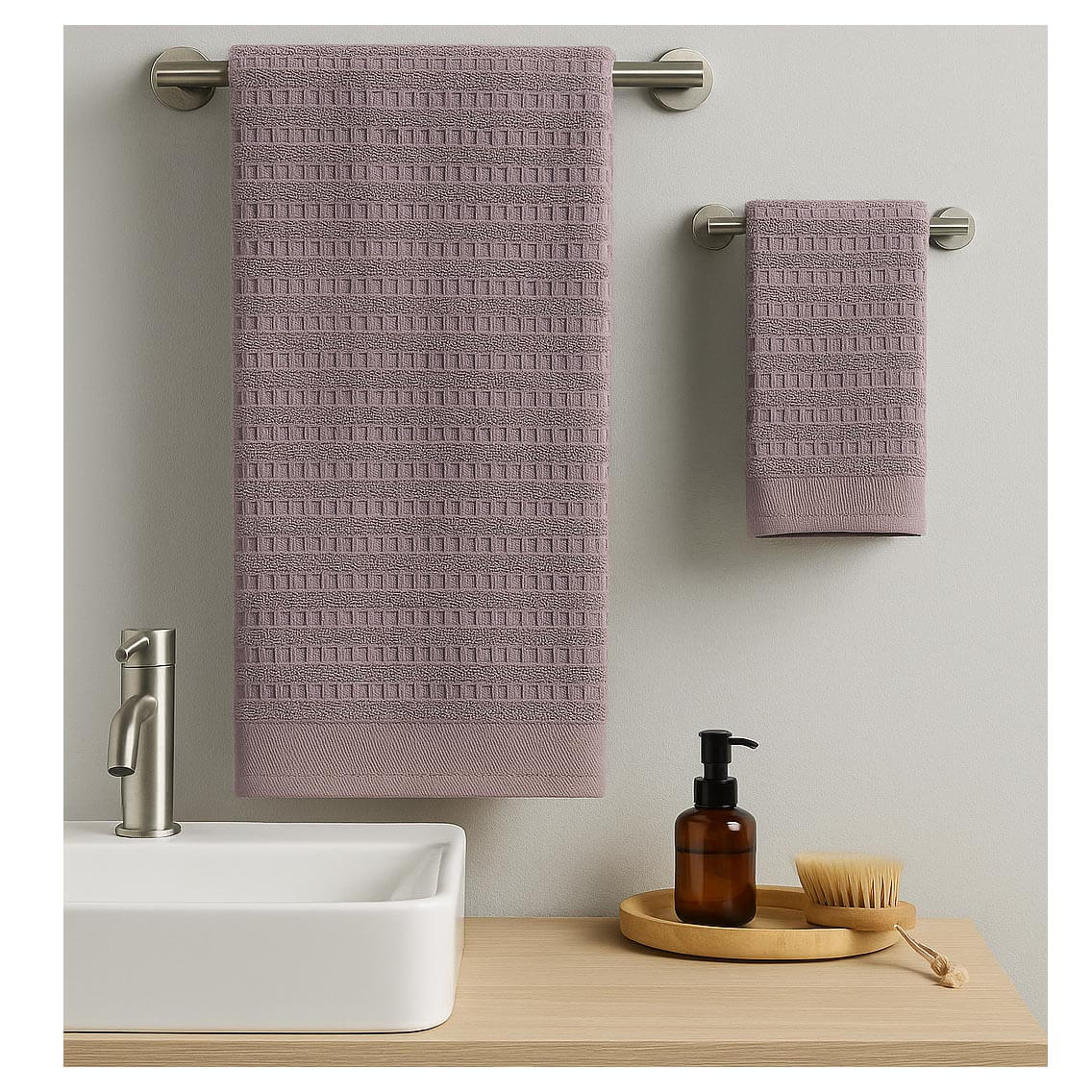 Σετ 2 τεμαχίων πετσέτες μπάνιου με διπλή γραμμή τετράγωνα στοιχεία (στη μεγάλη) και μονή σειρά τετράγωνα στοιχεία (στη μικρή) περιλαμβάνει: