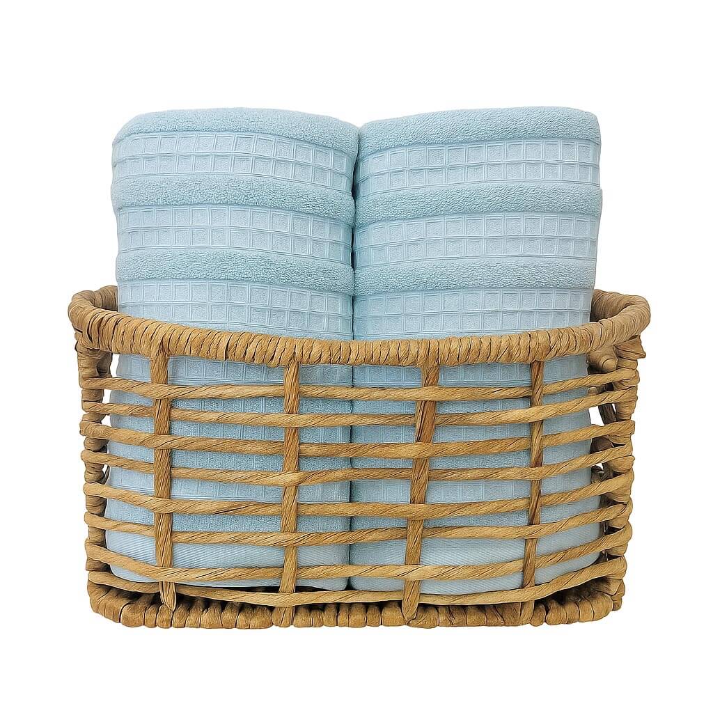 Σετ 2 τεμαχίων πετσέτες μπάνιου σε γαλάζια απόχρωση. Μονή σειρά τετράγωνα στοιχεία (στη μικρή) και διπλή σειρά τετράγωνα στοιχεία (στη μεγάλη)  περιλαμβάνει: