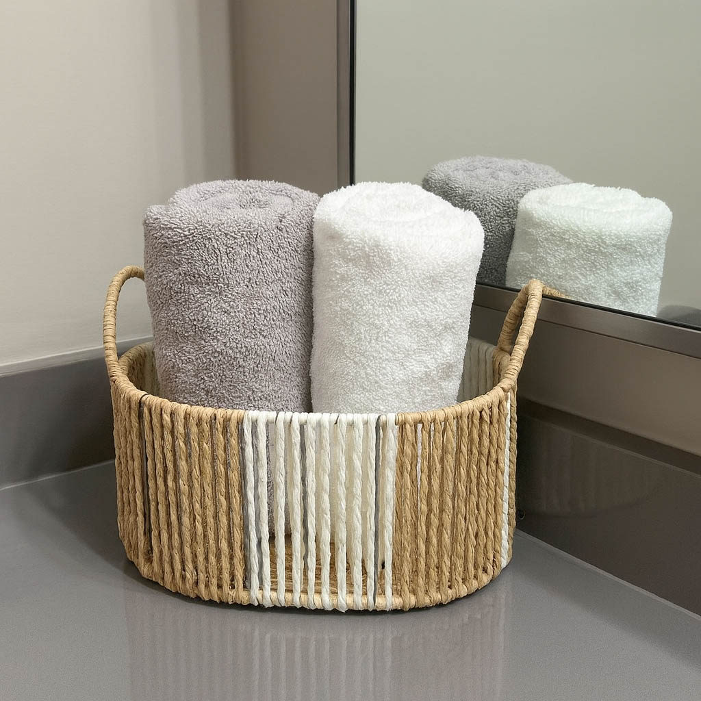 Διακοσμητικός ψάθινος δίσκος με μοντέρνο boho σχεδιασμό.Ο μοναδικός συνδυασμός natural και λευκών λεπτομερειών προσφέρει ένα καθαρό, αισθητικό αποτέλεσμα που ταιριάζει ιδανικά σε καθιστικά, υπνοδωμάτια, μπάνια ή επαγγελματικούς χώρους. Ο ρηχός σχεδιασμός του το καθιστά ιδανικό για χρήση ως διακοσμητικός δίσκος ή καλάθι οργάνωσης για πετσέτες και μικροαντικείμενα. Τα ενσωματωμένα χερούλια εξασφαλίζουν εύκολη μεταφορά και πρακτικότητα στην καθημερινή χρήση. Το σετ περιλαμβάνει 2 τεμάχια. Ένα μικρό και ένα μεγάλο καλάθι. Διαστάσεις : 26ΜΧ18ΠΧ9Υ / 30ΜΧ21ΠΧ10Υ.