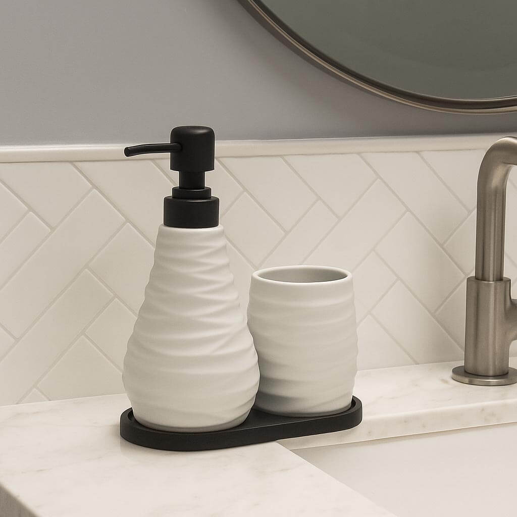 Σετ αξεσουάρ μπάνιου 3 τεμαχίων dispencer / ποτηροθήκη / βάση διαθέσιμο σε 3 αποχρώσεις. Πρακτικά και μοντέρνα υλικά για να διαμορφώσετε κατάλληλα το χώρο σας.