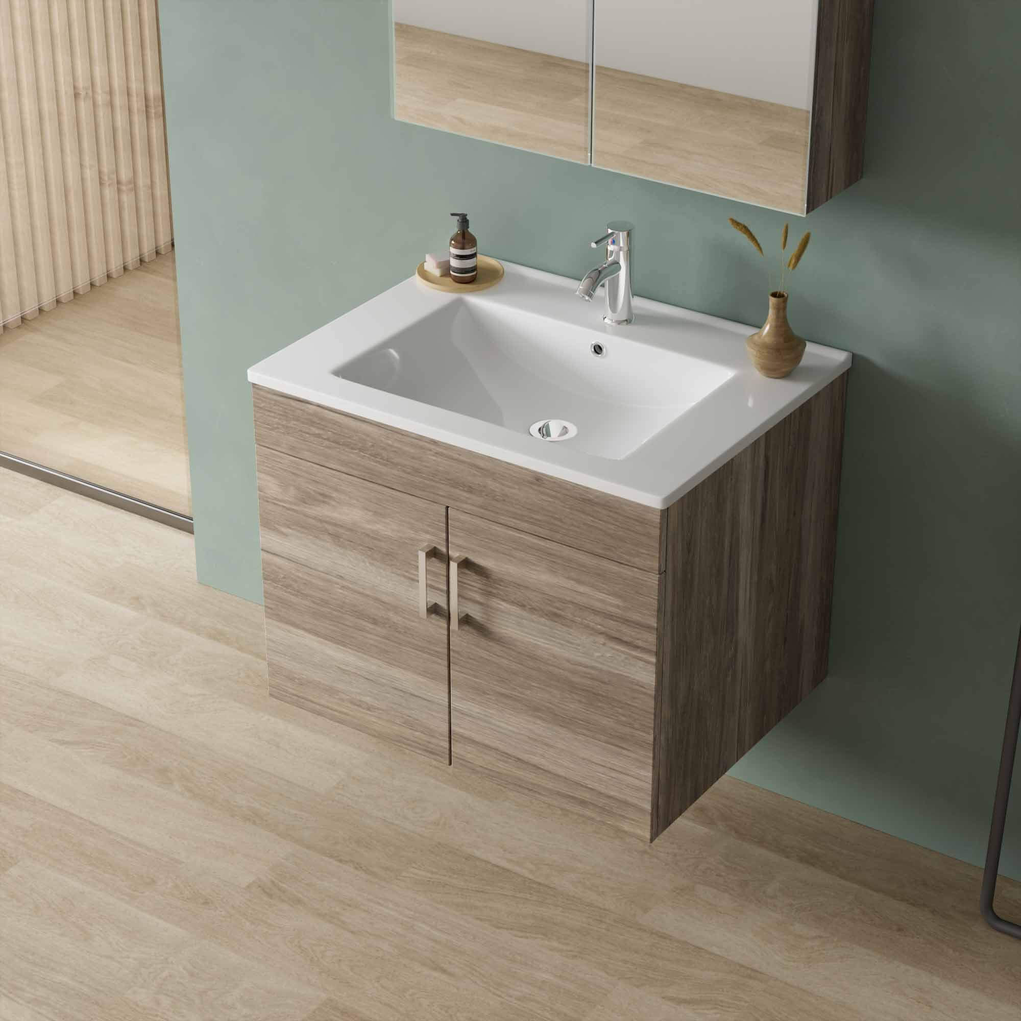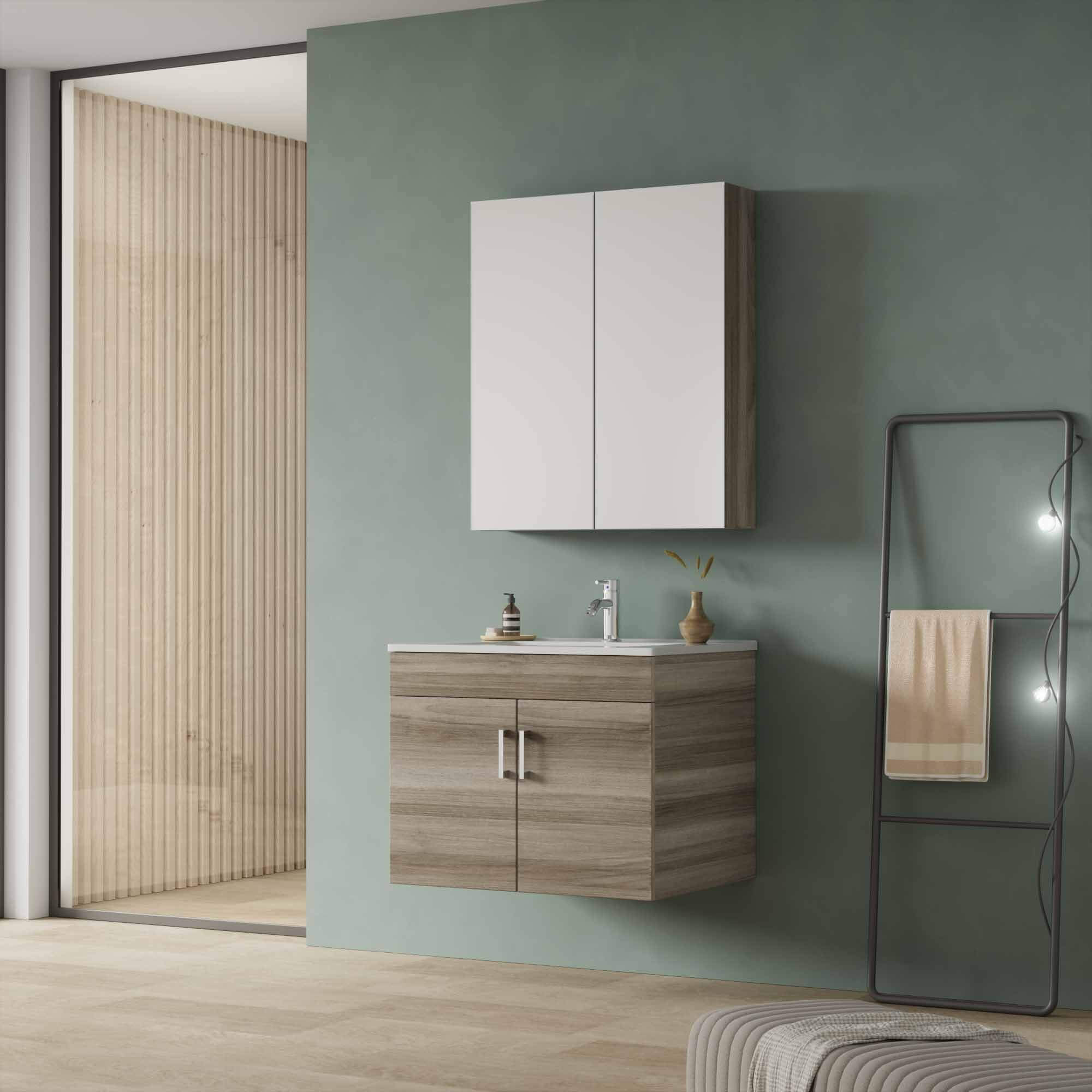 Κρεμαστό σετ Easyline Oak Wood έπιπλο μπάνιου διαθέσιμο σε 3 διαστάσεις. Κατασκευασμένο από MDF υλικό και νιπτήρα ένθετο slim από πορσελάνη. Διαθέτει καθρέφτη / ντουλάπι με 3 εσωτερικά ράφια. Ο νιπτήρας διαθέτει οπή για μπαταρία και υπερχείλιση. Μοναδικός σχεδιασμός για την οργάνωση του μπάνιου σας.
