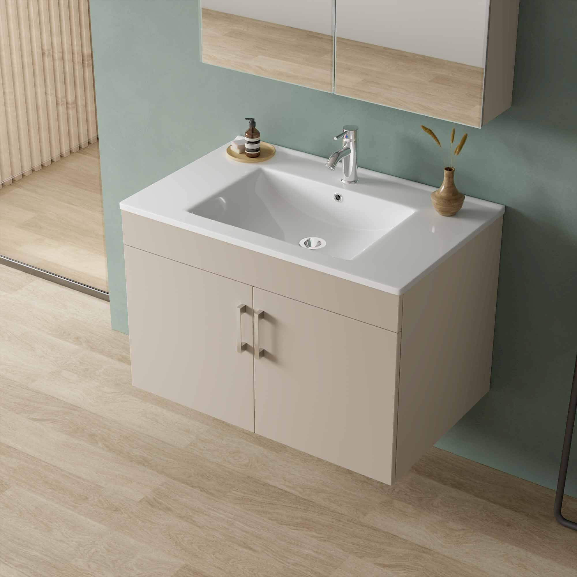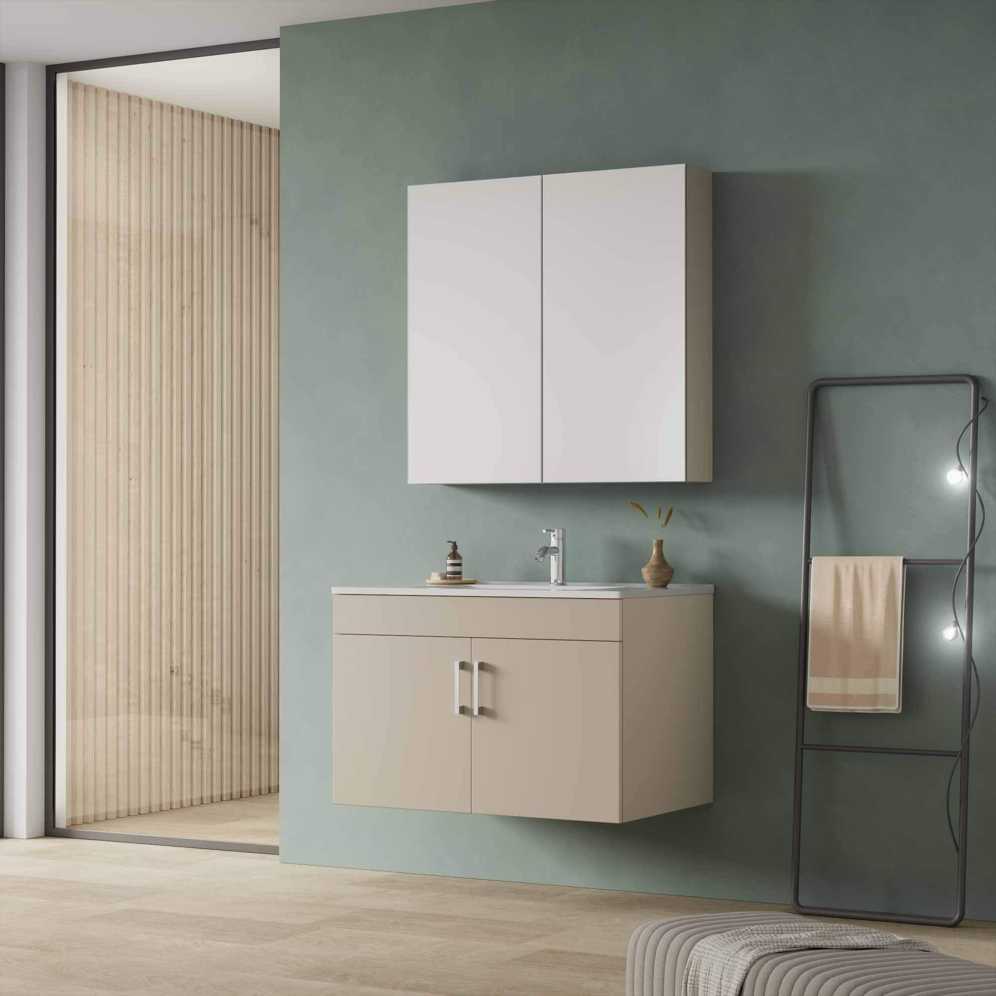 Κρεμαστό σετ Easyline Taupe έπιπλο μπάνιου διαθέσιμο σε 3 διαστάσεις. Κατασκευασμένο από MDF υλικό και νιπτήρα ένθετο slim από πορσελάνη. Διαθέτει καθρέφτη / ντουλάπι με 3 εσωτερικά ράφια. Ο νιπτήρας διαθέτει οπή για μπαταρία και υπερχείλιση. Μοναδικός σχεδιασμός για την οργάνωση του μπάνιου σας.