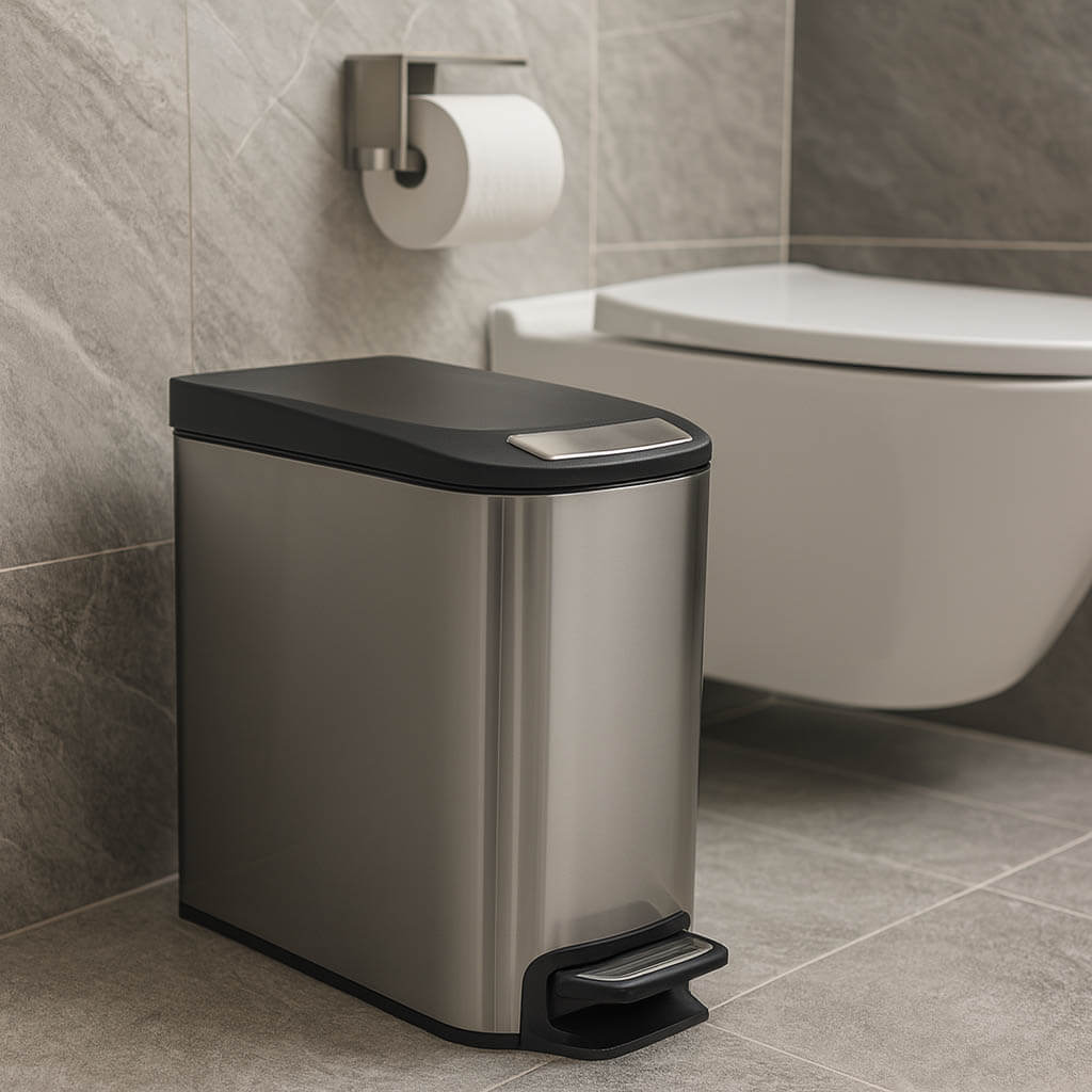 Κάδος Απορριμμάτων Μπάνιου Inox 6 LT. Ορθογώνιο σχήμα με pedal soft close για αθόρυβη χρήση. Στο πίσω μέρος διαθέτει λαβή για εύκολη μετακίνηση. Στο εσωτερικό έχει πλαστικό αποσπώμενο κάδο για ευκολία στο καθάρισμα αλλά και για μεγάλη αντοχή. Μοντέρνα αξεσουάρ μπάνιου για να διαμορφώσετε κατάλληλα τον χώρο σας. Μπορεί να χρησιμοποιηθεί και σε γραφείο ή κουζίνα.