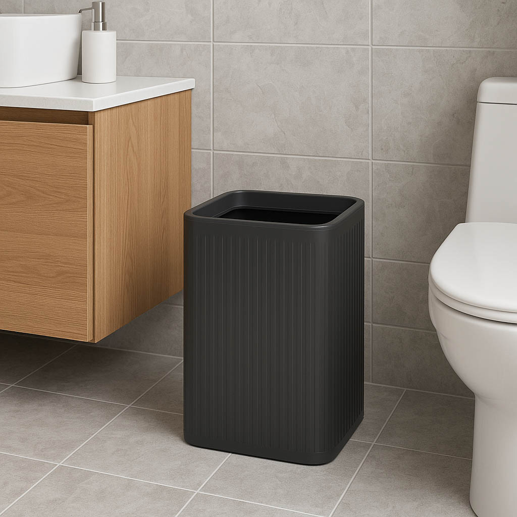 Κάδος απορριμμάτων μπάνιου 10LT πλαστικός σε μαύρο χρώμα. Δεν διαθέτει καπάκι. Ανθεκτικό πλαστικό για αντοχή στο χρόνο και την υγρασία. Μοντέρνα αξεσουάρ μπάνιου για να διαμορφώσετε κατάλληλα τον χώρο σας.