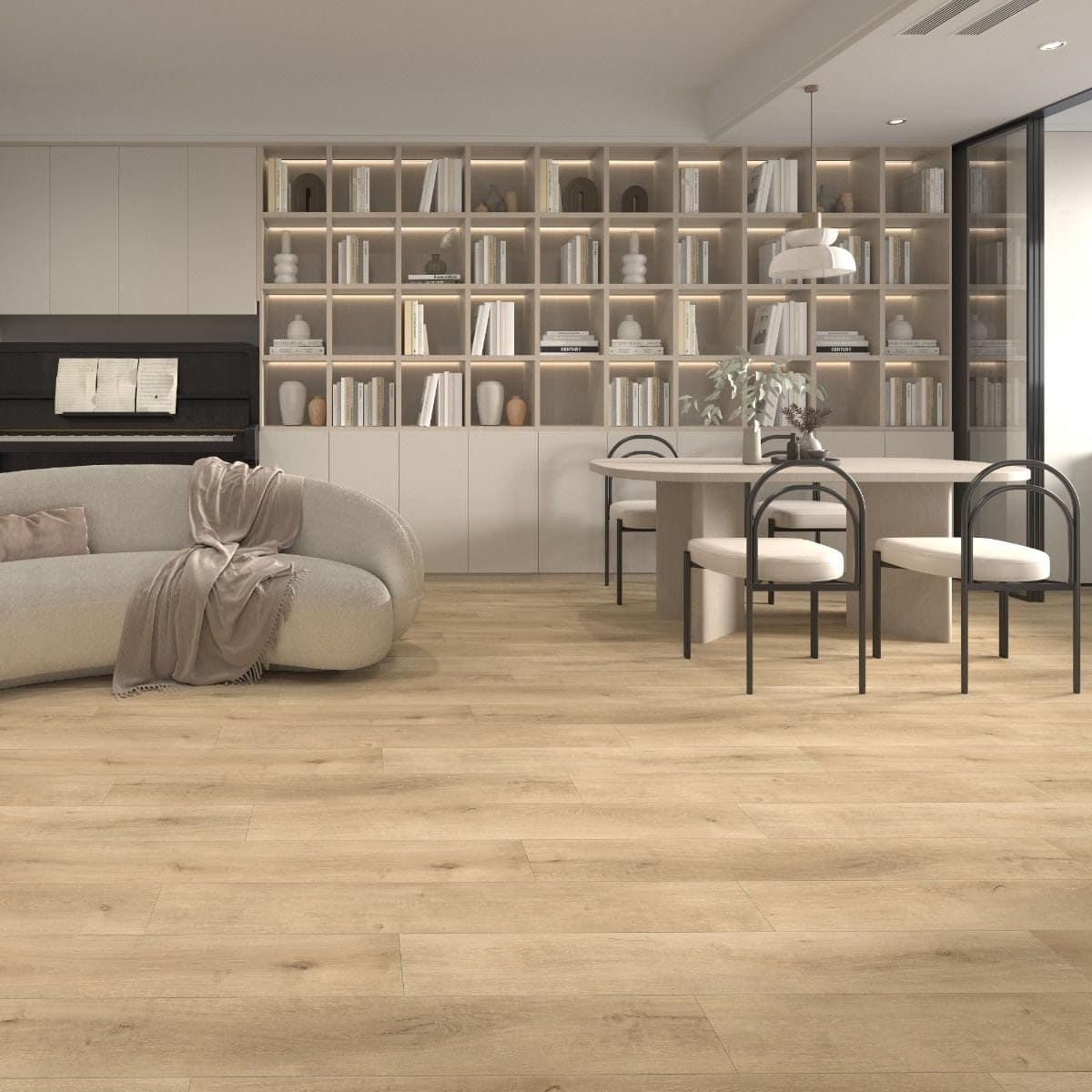Leccio Haya τύπου ξύλο βινυλικό δάπεδο SPC. Προσφέρει αντοχή, σταθερότητα και πλήρη αδιαβροχοποίηση. Ιδανικό για μικρούς ή μεγάλους χώρους που χρειάζονται φυσικότητα και φωτεινότητα με αίσθηση ξύλου.