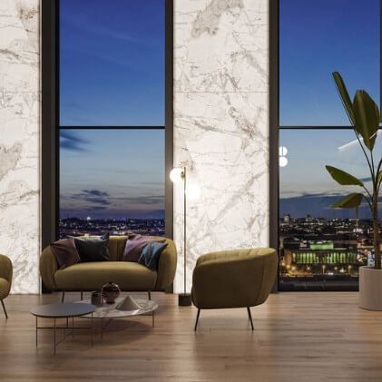Φωτοδιαπερατό slab Luce Marble White με polished φινίρισμα. Λευκό μάρμαρο με χρυσές φλέβες διάσταση 120x260cm και πάχος 6mm. Κατάλληλο για επένδυση τοίχου ή δημιουργία ειδικής κατασκευής. Οι πλάκες μπορούν να αποτελέσουν ένα εκπληκτικό κεντρικό στοιχείο για την δημιουργία της σχεδιαστική σας ιδέας και να δώσουν ένα εντυπωσιακό αποτέλεσμα αφού τις εμπλουτίσετε με τεχνολογία οπίσθιου φωτισμού.