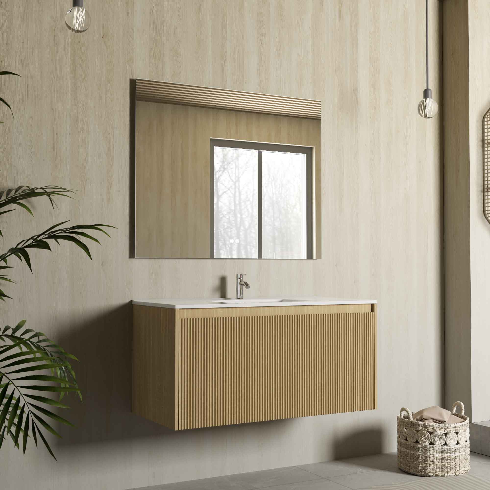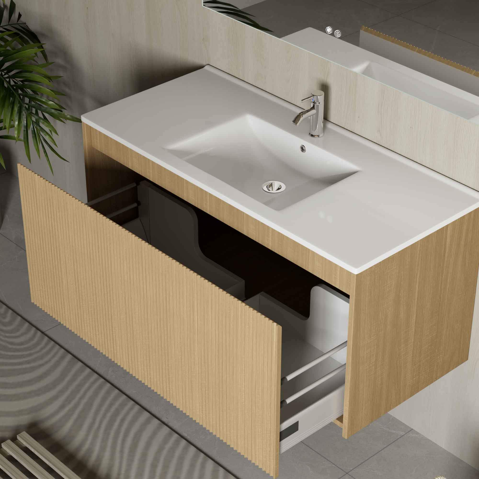 Kρεμαστό έπιπλο μπάνιου Rigato Oak με νιπτήρα Slim σε 3 μεγέθη(δεν περιλαμβάνει τον καθρέφτη). Κατασκευασμένο από PVC υλικό σε απόχρωση ξύλου Oak με 1 βαγονέτο. Ο νιπτήρας είναι από πορσελάνη και διαθέτει οπή για μπαταρία και υπερχείλιση. Μοναδικά έπιπλά μπάνιου για να διαμορφώσετε τον χώρο σας.