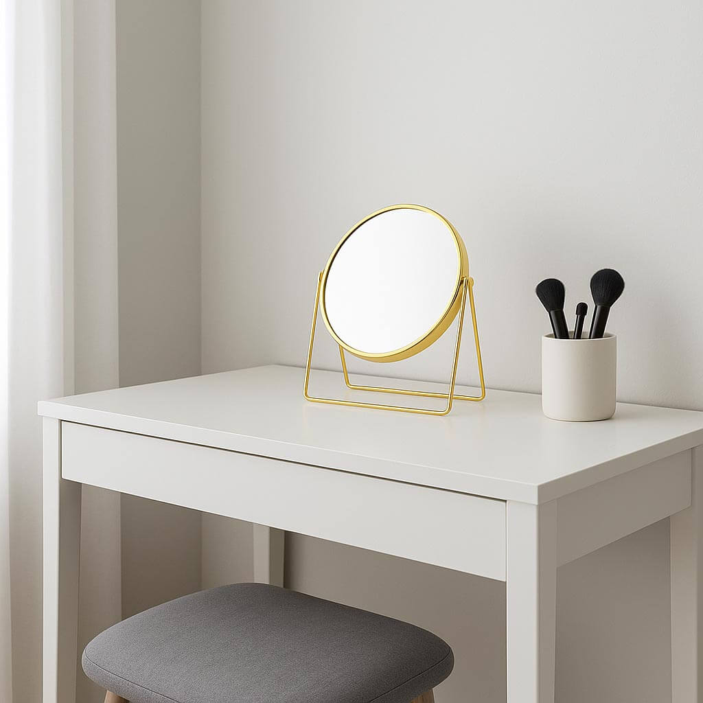 Round makeup καθρέφτης μακιγιάζ στρογγυλός και μεγεθυντικός από αλουμίνιο σε 4 αποχρώσεις. Είναι επιτραπέζιος με δυνατότητα περιστροφής. Iδανικός για μπάνιο, μπουντουάρ αλλά και για να τον έχετε μαζί σας σε ταξίδια. Aξεσουάρ σπιτιού για πρακτικότητα και εύκολη χρήση.
