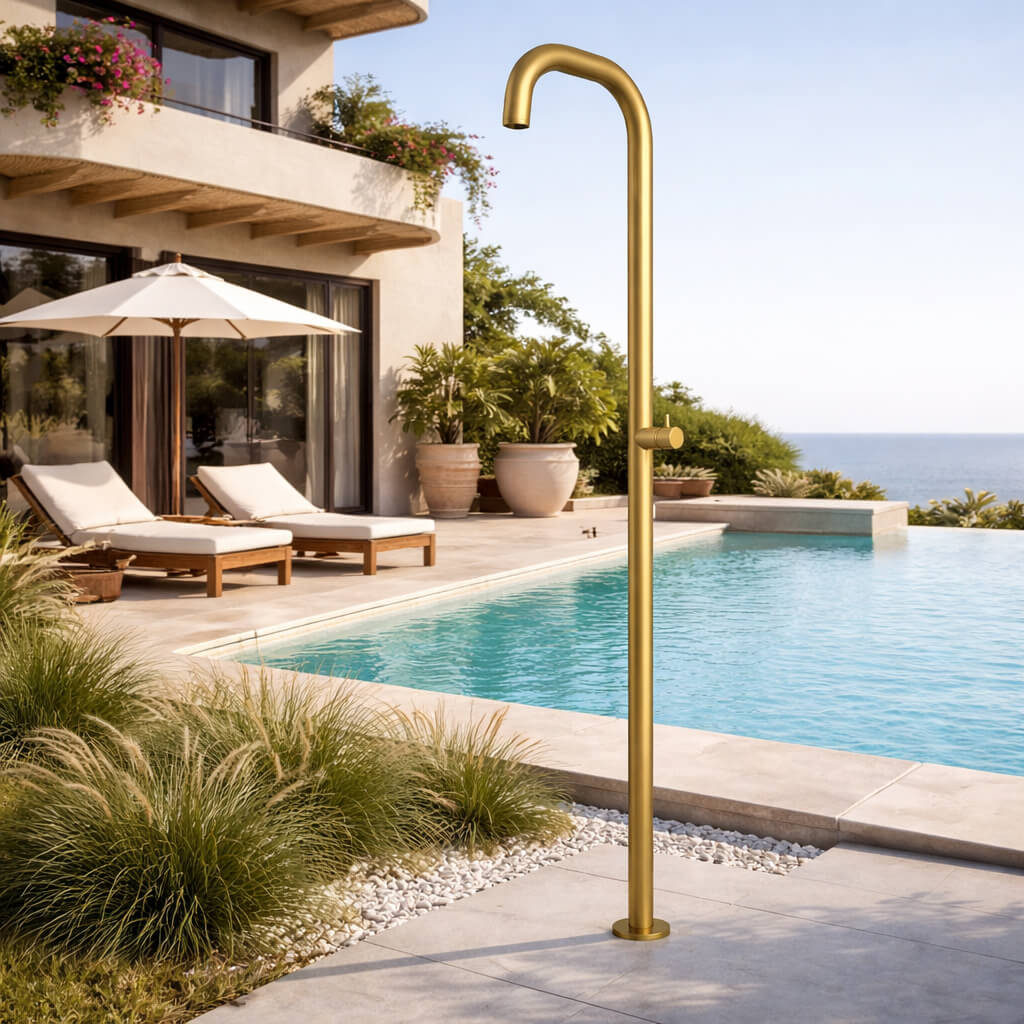 Zenith στήλη ντουζ πισίνας σε 3 χρώματα από την Corgres. Brushed black, satine και brushed gold. Διαθέτει φινίρισμα PVD (Physical Vapor Deposition), μια κορυφαία τεχνολογία επίστρωσης που προσφέρει εξαιρετική αντοχή σε γρατσουνιές, λεκέδες και ξεθώριασμα, διατηρώντας το χρώμα αναλλοίωτο για μεγάλο διάστημα. Υψηλή αντοχή και αισθητική κατάλληλο για εξωτερικούς χώρους πισίνας. Aναμοικτική στήλη ντουζ ζεστού και κρύου νερού (διατίθενται ανταλλακτικά).